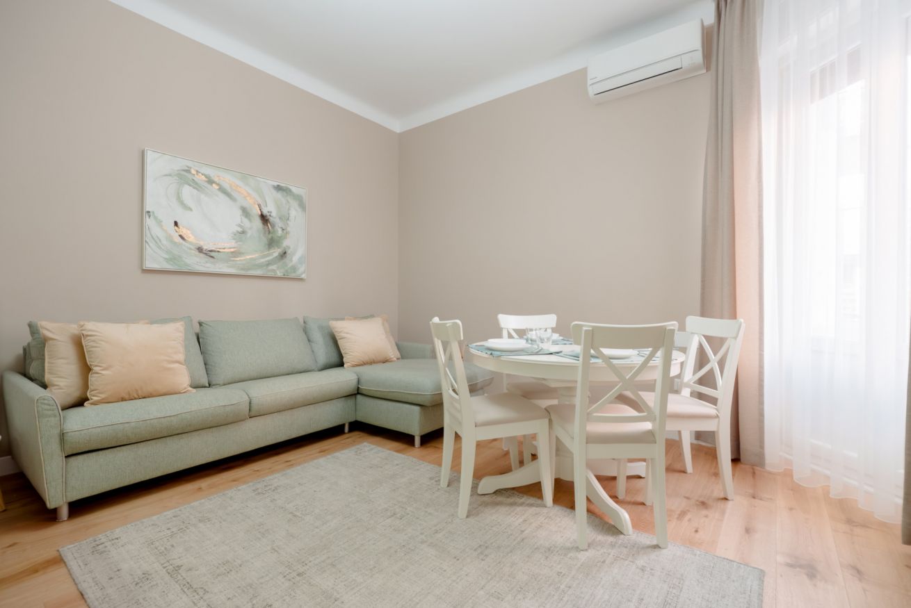 La zona giorno è accogliente e funzionale, con accesso a un balcone affacciato su una strada tranquilla.