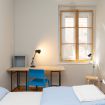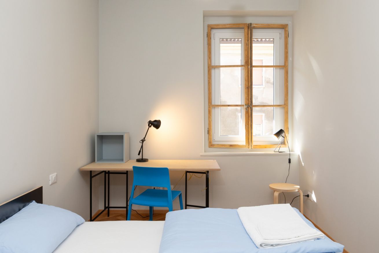 One bedroom with a double bed, complete with a desk and a clothes rack.