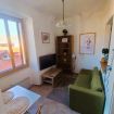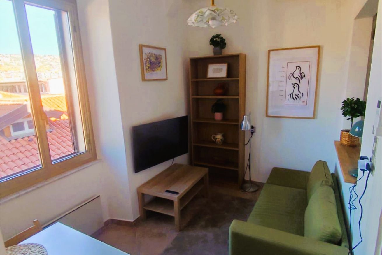 L'appartamento può ospitare fino a 3 persone. Al suo interno troverai una camera da letto matrimoniale con vista aperta sui tetti, un cucinino con forno, lavatrice, e piccoli elettrodomestici come bollitore e tostapane, e una zona giorno con TV e divano letto per il terzo ospite.